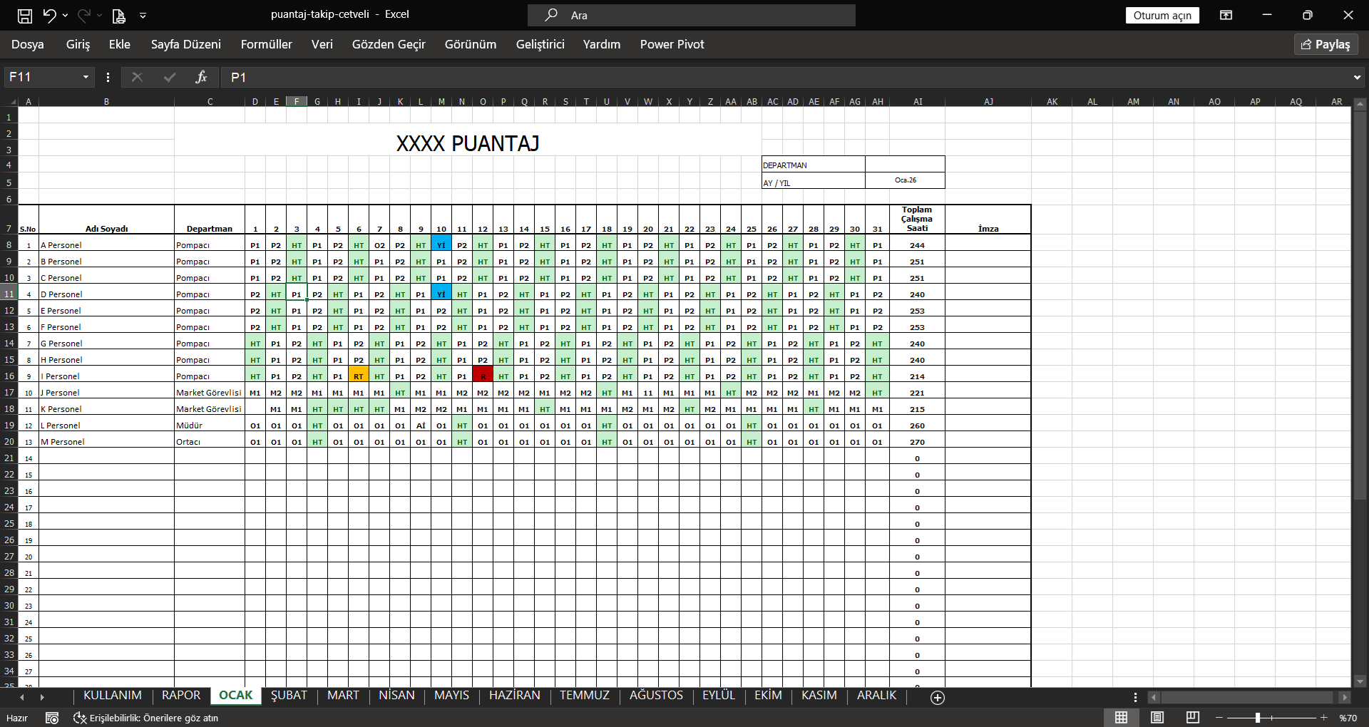 - Vardiya Kod Sistemi: Tabloda yer alan P1, P2 gibi kodlar sayesinde personelin hangi vardiyada olduğunu hızlıca işaretleyebilirsiniz. Her kod, arka planda tanımlı olan çalışma saatini otomatik olarak toplama dahil eder.
