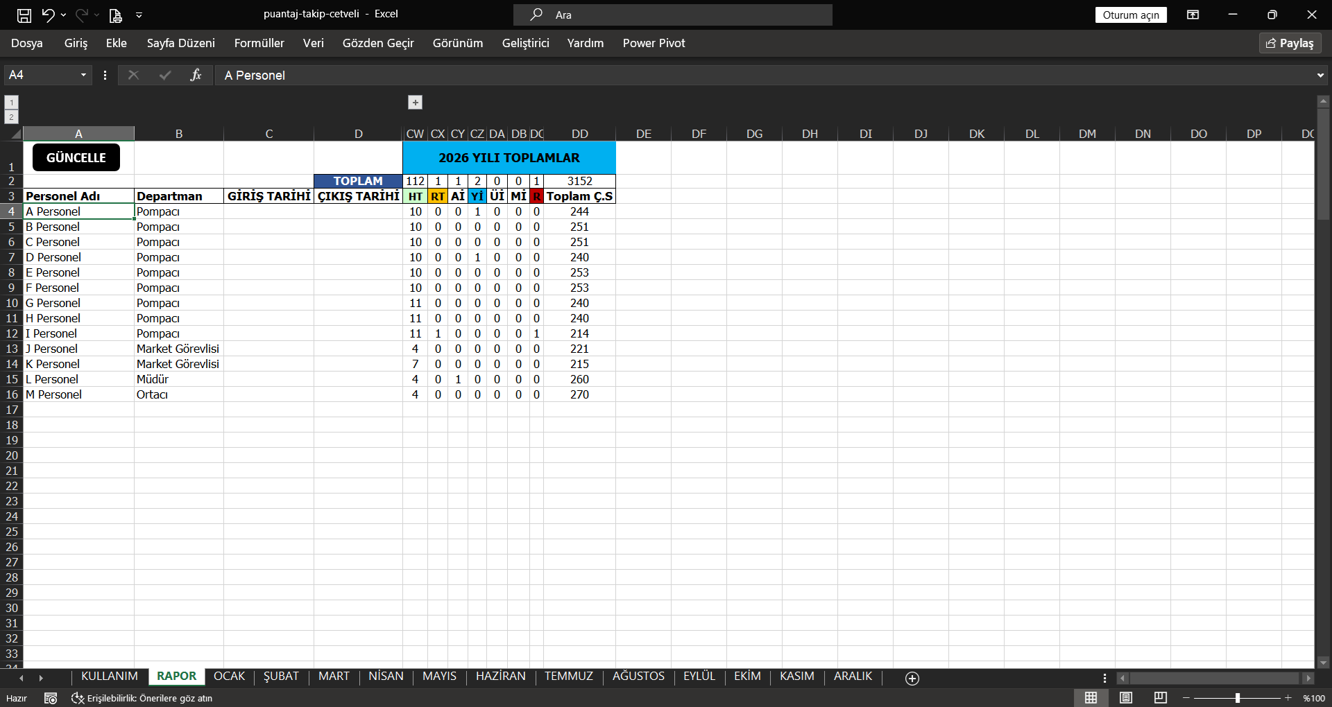 - Yıllık Konsolide Rapor: Aylık sayfaların yanı sıra "RAPOR" sekmesi üzerinden personelin tüm yıl boyunca sergilediği performans ve devamsızlık özetini tek bir ekranda görebilirsiniz.